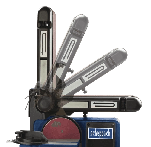 – Le bras supportant la bande de ponçage peut être positionné à un angle allant de 90° à la verticale à la position horizontale.